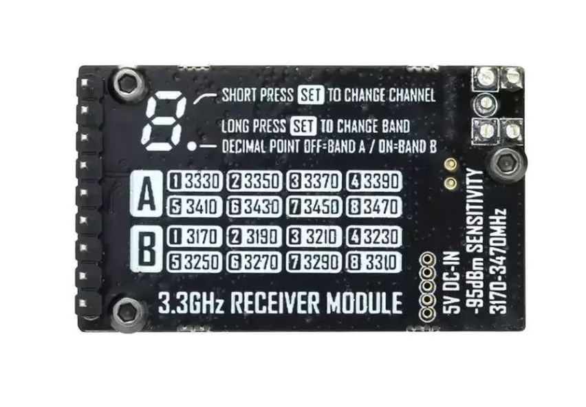 This high-power 3.3GHz transmitter set is engineered for professional applications requiring robust signal penetration and a stable, long-range video link. Operating on a less common frequency, it is ideal for specialized FPV systems and environments where minimizing interference from standard bands is critical.